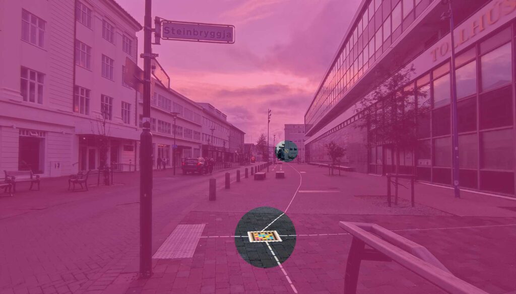 Take Lækjatorg as an example. The bus stop has a Navilens code – which is poorly placed and fairly hidden, to be honest – but there are no floor tactile maps leading towards the bus stops. While Austurstræti and Lækjatorg are fairly accessible places, a blind person would have difficulties to orient themself out in the open.